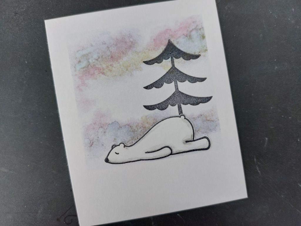 I worked on one of the Autumn/Winter Backdrop Landscape tags and stamped the tree directly onto it with black Archival ink. I then stamped the little bear onto a scrap of Clarity’s super smooth paper, added shading with a grey Polychromo pencil and fussy cut him. I could then glue him onto the topper, to lie in front of the tree.