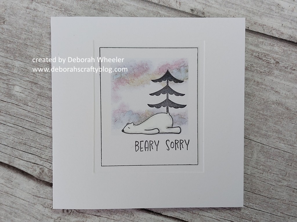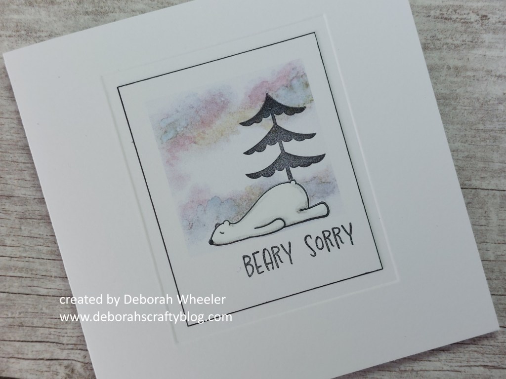 As I’d used one of the little tags and the smaller bear, I didn’t have room for the full sentiment from the set, so masked part of it off with low tack tape before inking to leave my just the ‘beary sorry’, which was the perfect size! I ran around the edge of the topper with a black Sharpie, then used a square embedder and a ball tool to emboss a frame onto the front of a 5×5 card – as the topper is a rectangle, I needed to lengthen the frame, so first embossed around the top & partway down each side of the embedder, then moved it down to the right length to finish each side and the bottom. All that then remained was to sit the topper inside the frame.