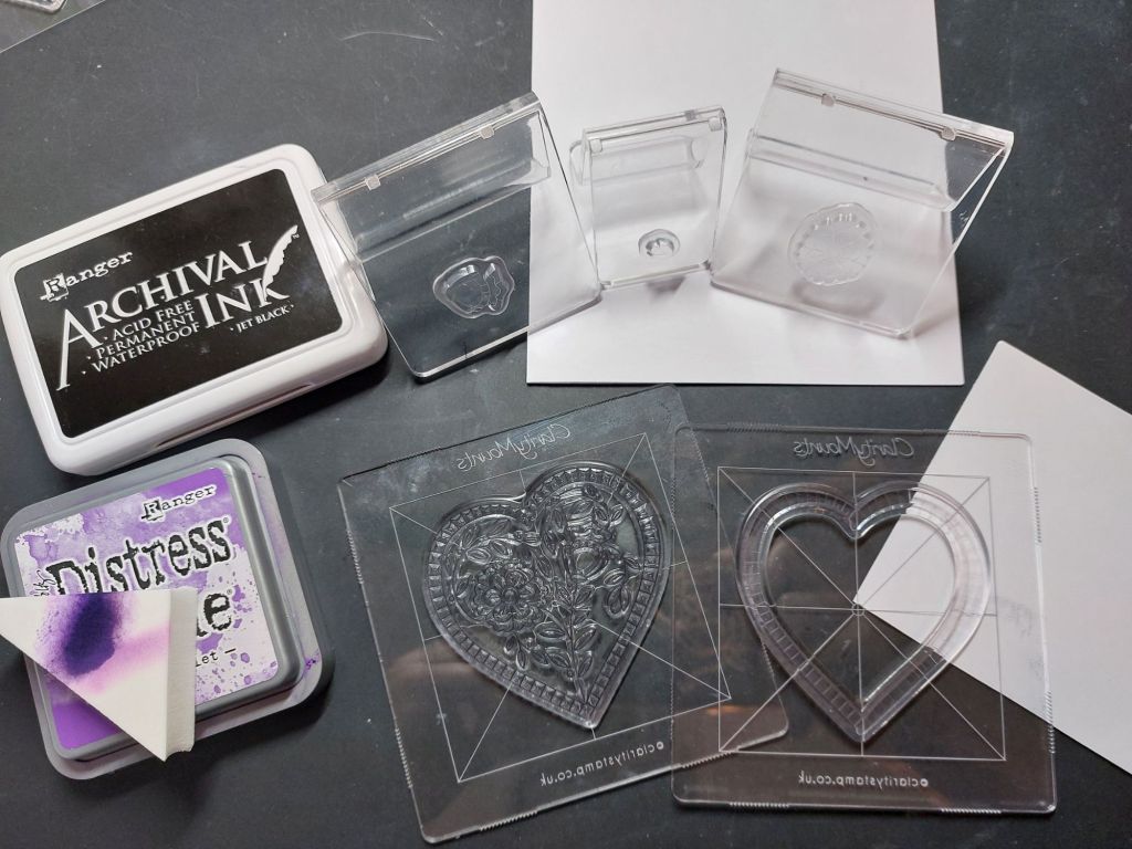Now, the rules of our challenge are that you can gather together everything you need in advance, including mounting your stamps, etc, but the clock has to start the minute you start to ink them up or cut your paper. I made a good attempt at getting everything that I need lined up (not my strongest point!), with my stamps all mounted and my ink pads at the ready…