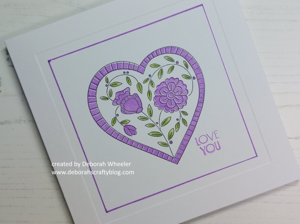 I then pressed ‘start’ on my stopwatch and set off! I first stamped the outline floral heart in black onto a 3.5″ square of stencil card, then sponged ‘wilted violet’ Distress Oxide onto the infill stamps that are part of the set (the frame and three flowers) to quickly add colour. Next was to shade the leaves with ‘may green’ and ‘permanent green olive’ Polychromo pencils, using the ‘violet’ one to add the dots. I quickly stamped te sentiment with the ‘wilted violet’ and then ran a purple Sharpie around the topper edges. Turning to my 5×5 card blank, I embossed a frame onto it with a square embedder and a ball tool (I do this so often I’ve got pretty fast at it now!) and then attached the topper to it.