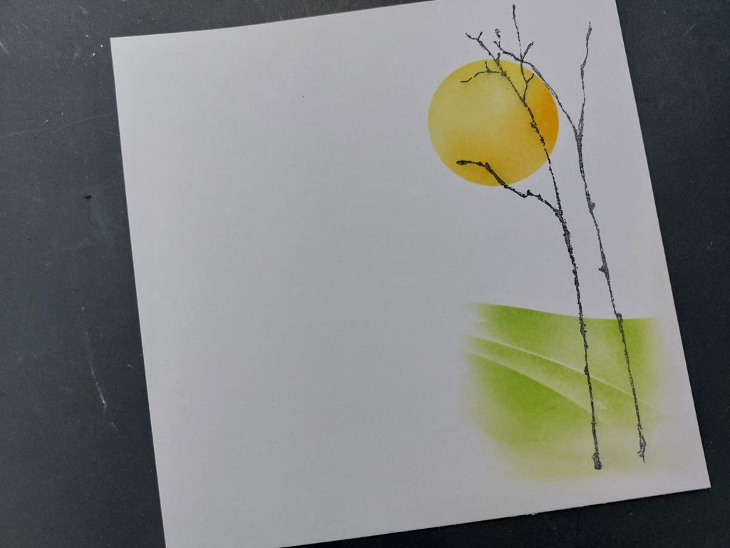 With sunny and warmer days having finally arrived in the UK after a very wet and grey start to 2026, I decided to channel that vibe on this card, starting by stamping two of the twigs with ‘watering can’ Archival ink onto a topper cut to fit a 6×6 card blank. I then took a moon mask, placed the outer part over my trees and sponged ‘squeezed lemonade’ and ‘carved pumpkin’ Distress Oxides into it for a lovely warm sun. I then swapped to one of the new 3.3″ Square Landscape Masks to create the ground with ‘mowed lawn’ Distress Oxide, just using part of the mask to keep the image to the right of the topper.