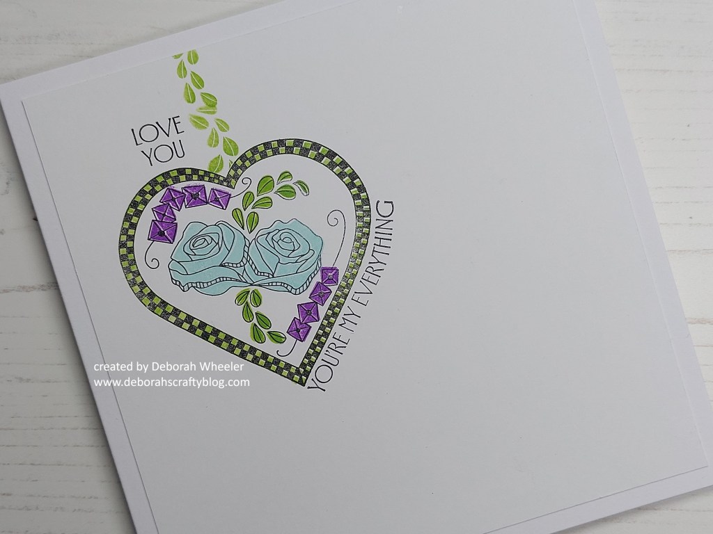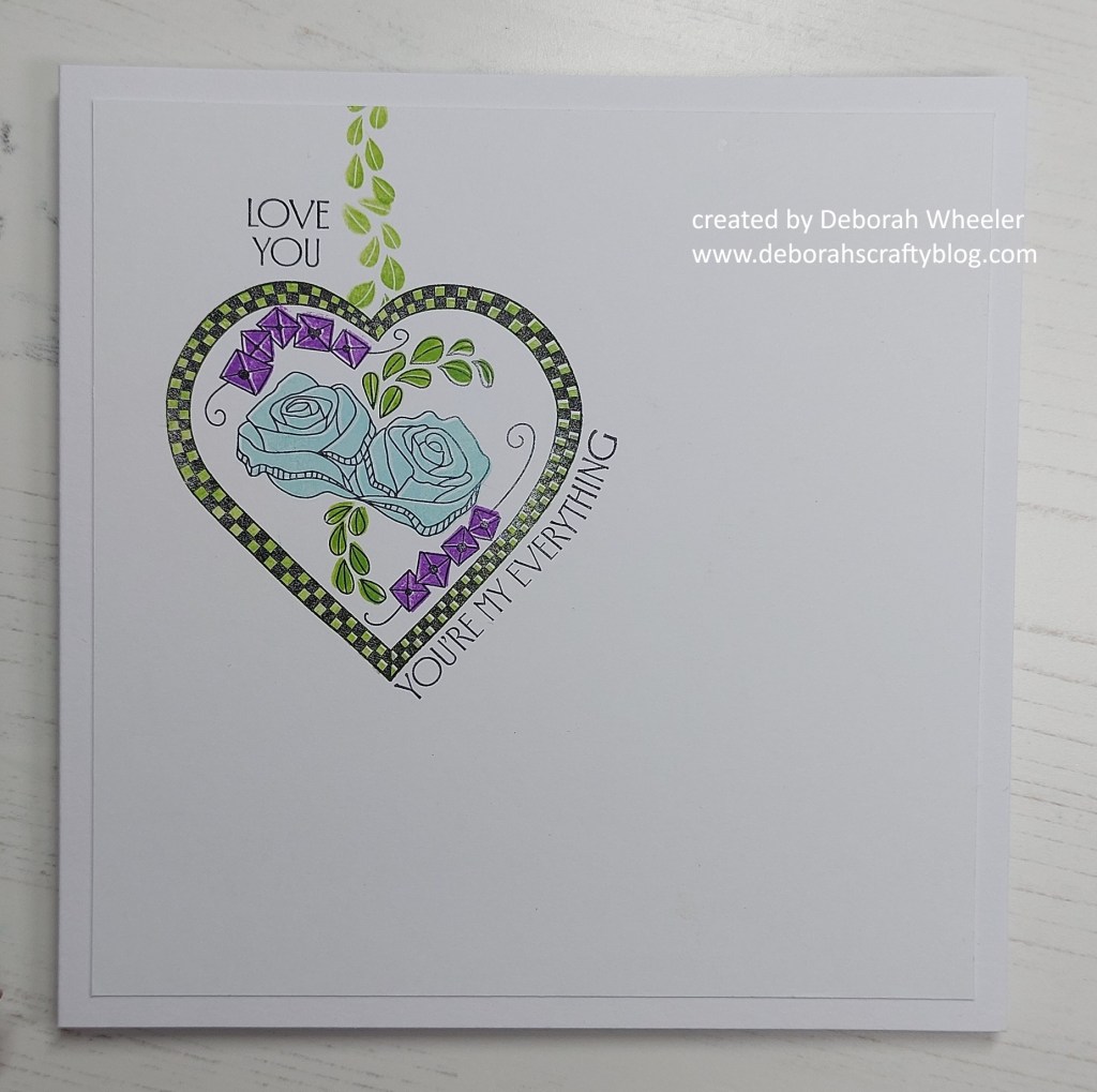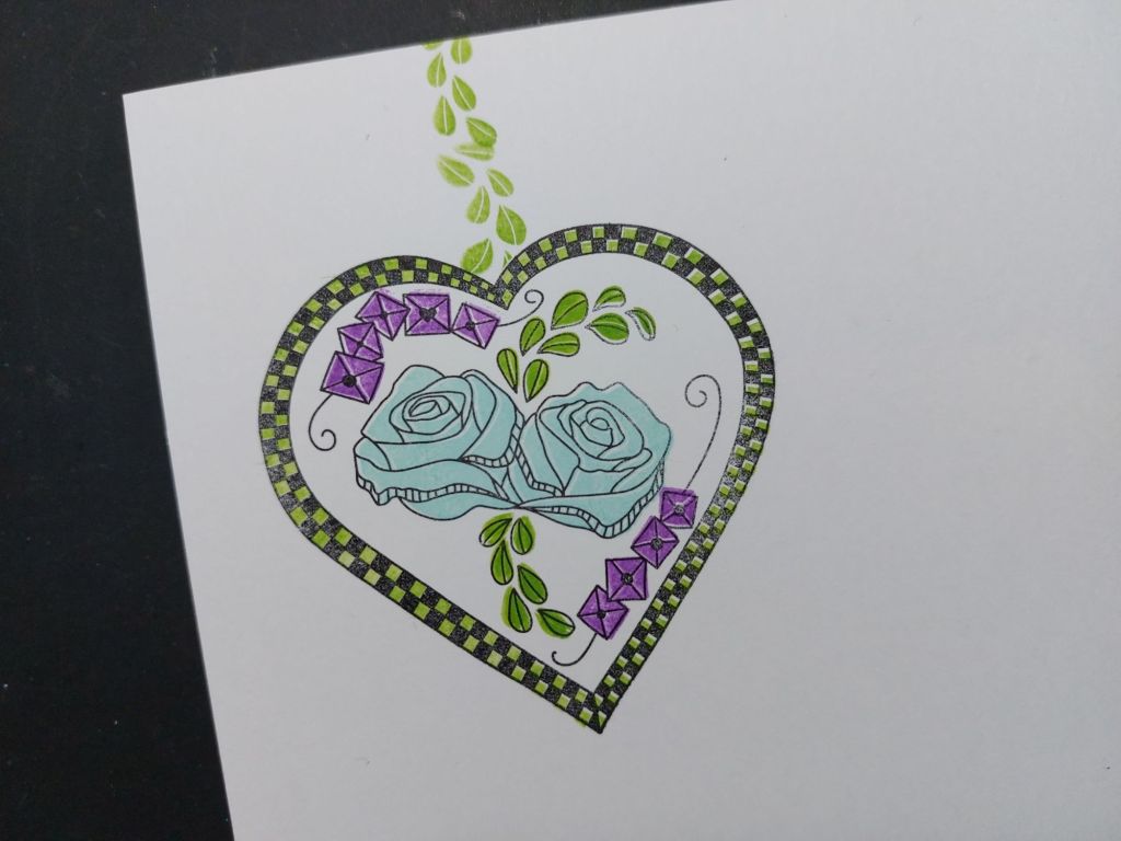 So, having cut a piece of Clarity’s premium card to 5.5″ square, I stamped the roses heart image in black Archival ink and covered it with the pre-cut mask that comes with the stamps. I then added a little chain of leaves to hang it from, using one of the infill stamps and ‘mowed lawn’ Distress Oxide.