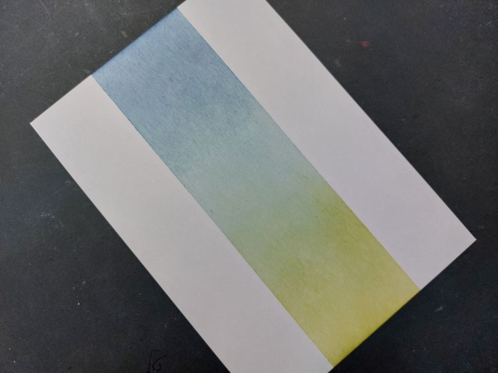Having cut a topper to fit on an A6 card blank, I ran low tack tape down either side to create a central panel. I could then use stencil brushes to blend ‘uncharted mariner’, ‘speckled egg’ and ‘peeled paint’ Distress Oxides into the panel – I added the top and bottom inks first, then used the ‘speckled egg’ in the centre, blending it up into the blue above and green below to give me a smooth ombre effect.