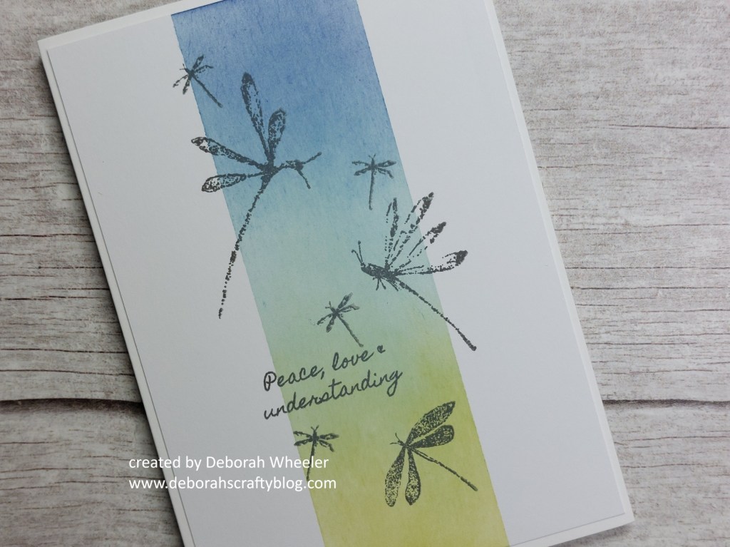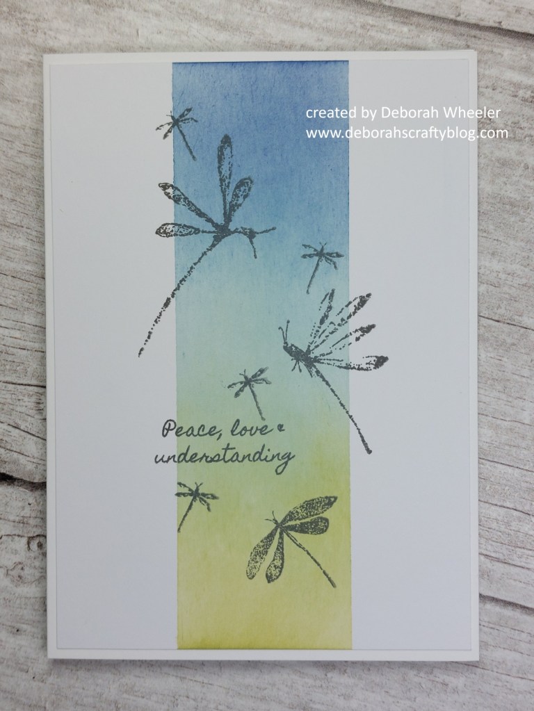 It was then a simple matter to stamp one of the sentiments and a swarm of dragonflies around it in ‘watering can’ grey Archival ink. before adding the topper to the card blank.