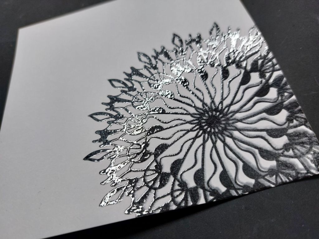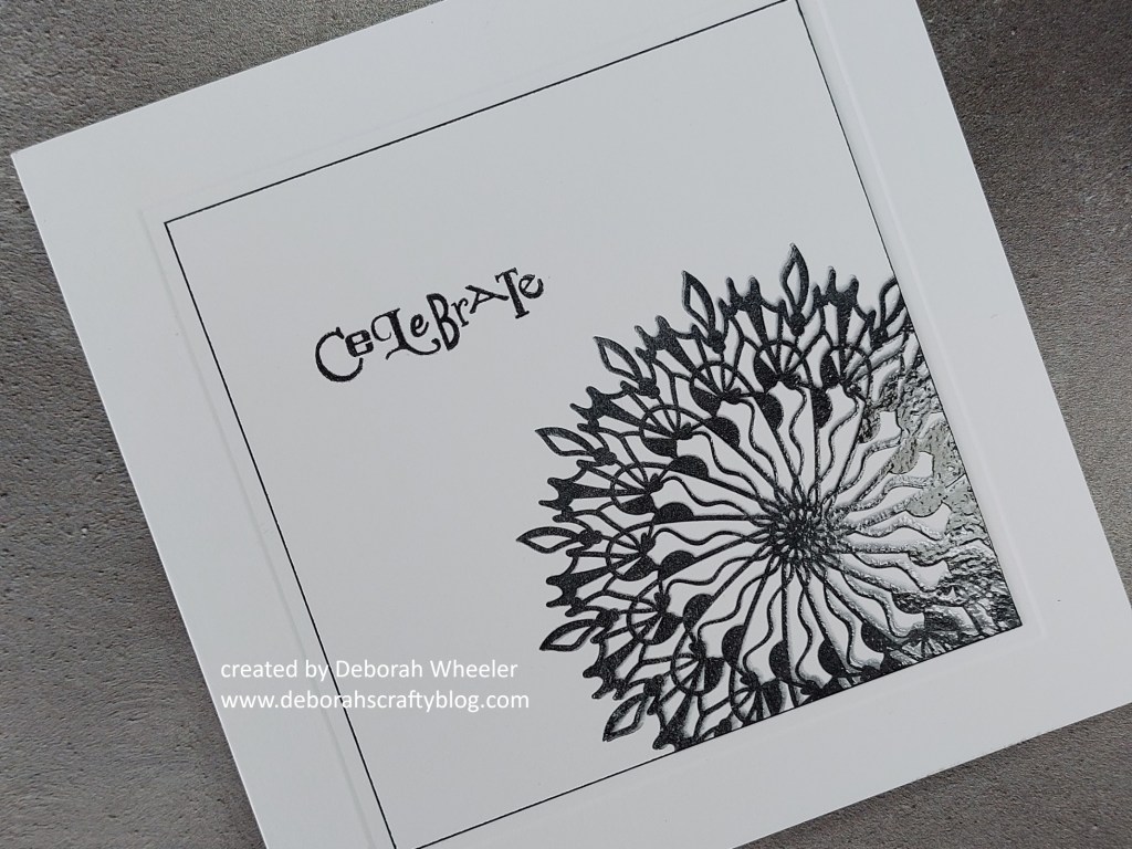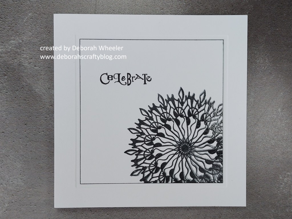This is a simple process (my favourite kind!) I first cut a piece of premium card to 4.5″ square which I rubbed with an anti-static pad, then inked up the Pinwheel Doodle Round stamp (I used Versafine Clair, which is a bit more juicy than Archival) and stamped it across the corner of the card. I then covered it with clear embossing powder and set it with my heat gun – it’s a great way of making the black ink really stand out. You may be able to see that I smudged the image right in the corner, but I decided that I quite like the effect (well, that’s my story and I’m sticking to it!)