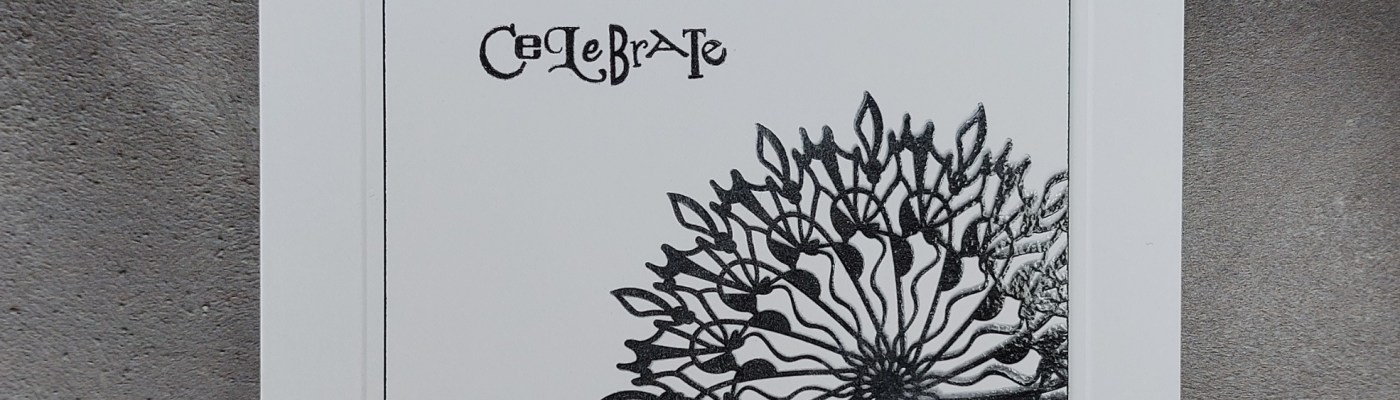 This is a simple process (my favourite kind!) I first cut a piece of premium card to 4.5″ square which I rubbed with an anti-static pad, then inked up the Pinwheel Doodle Round stamp (I used Versafine Clair, which is a bit more juicy than Archival) and stamped it across the corner of the card. I then covered it with clear embossing powder and set it with my heat gun – it’s a great way of making the black ink really stand out. You may be able to see that I smudged the image right in the corner, but I decided that I quite like the effect (well, that’s my story and I’m sticking to it!)