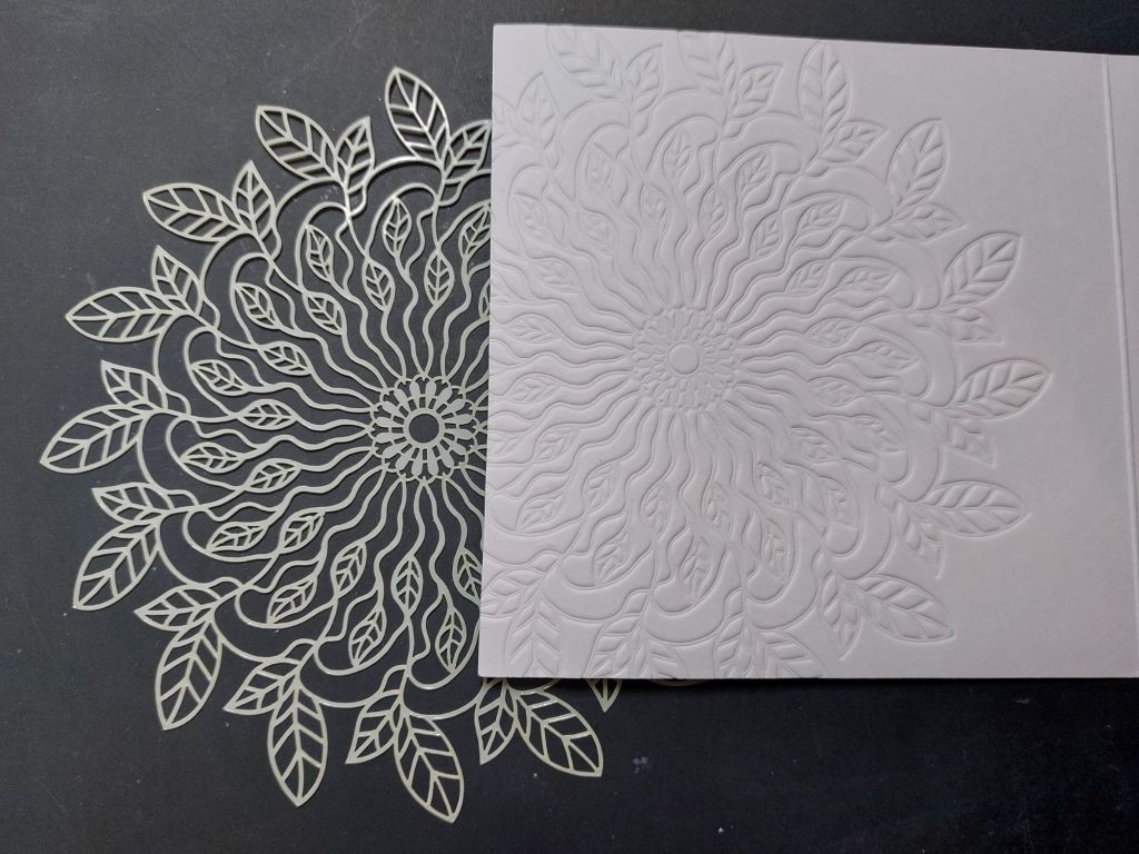 The key to this design is to emboss the stencil into the card using your die cutting machine and a rubber shim (details of exactly what plate combination to use for that should be in your machine’s instructions). I wanted the embossing to be raised on the front of the card blank I used, so placed the stencil on the inside of the front cover so it would embed onto it. If you’re not sure about doing this directly on the card blank, it’s very easy to do it onto a topper and then attach that afterwards (which is what I did on the show).