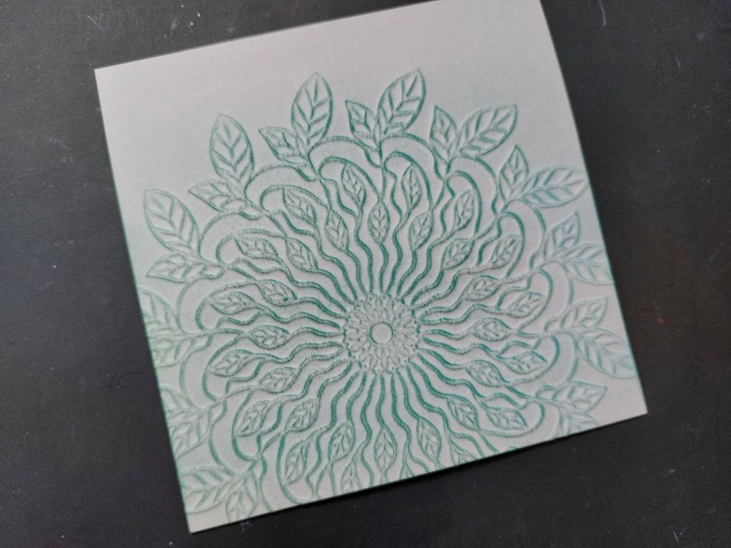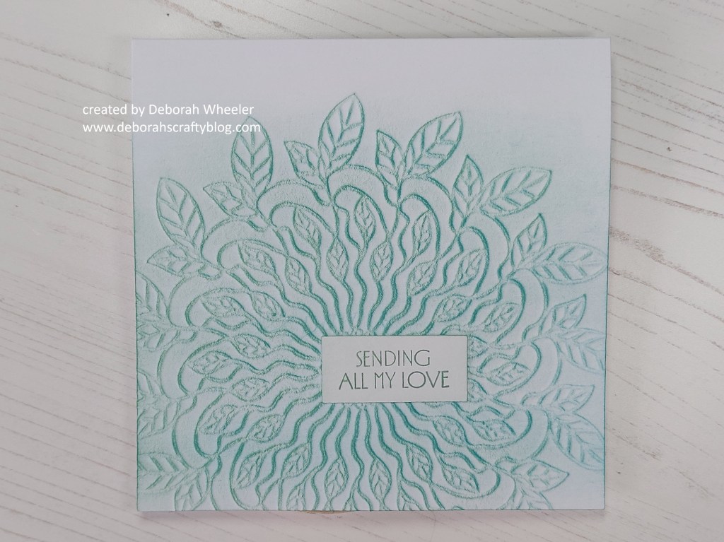So, having lifted the stencil off, I turned the card back to the front and started to brush lightly with Distress Oxides. I first went with ‘peacock feathers’, sweeping in one direction from the right so the ink caught the edge of the embossed image. I then switched to ‘evergreen bough’, but this time sweeping it in from the left, which gave me a little more depth to the shading.
