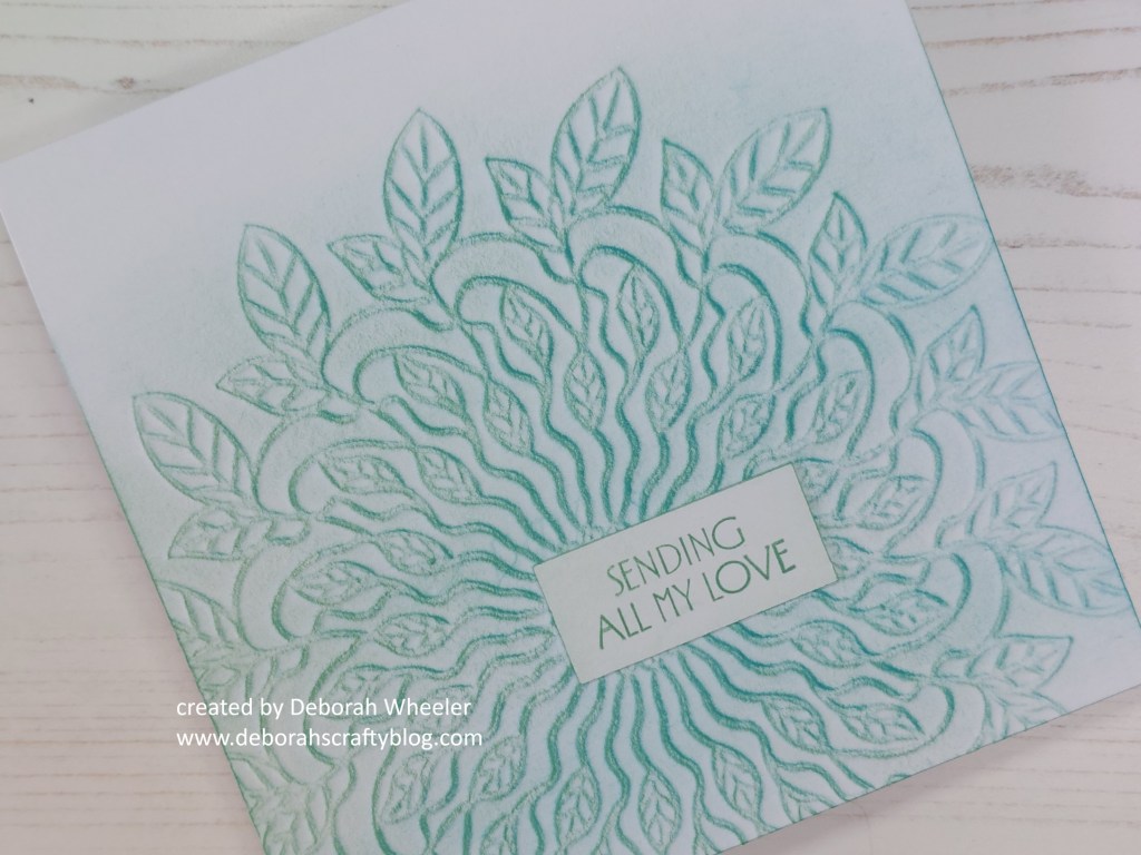 I left the top of the card without ink brushed on it, which left an ombre effect above the leaves. I then simply stamped one of the sentiments from the Floral Hearts set with ‘evergreen bough’ onto a scrap of card, brushed the ink in from the edges and simply glued it into place.