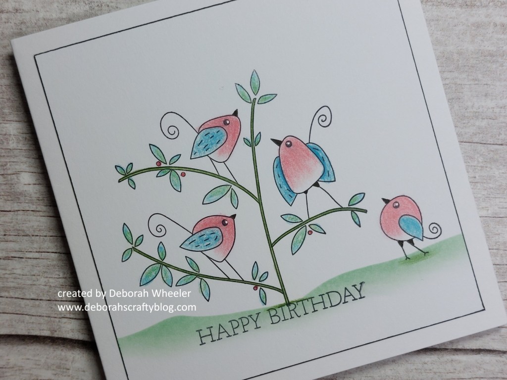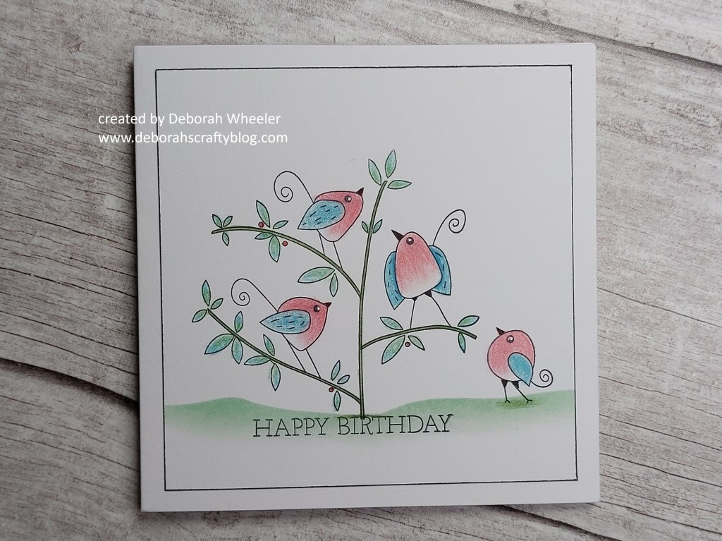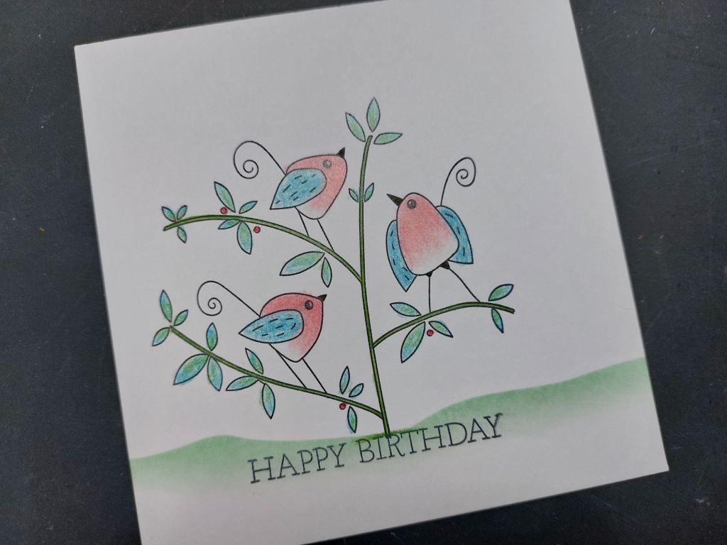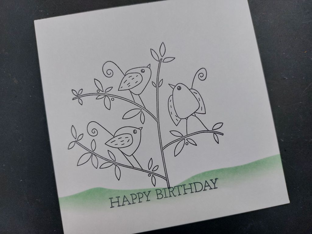 I was going to finish it there, but felt that the image needed balancing a bit more on the right, so added in one of the single birds, stamping him on the ground and use the same colours to shade him in. I then simply ran a black Sharpie around the edges of the topper and attached it to a 5×5 card blank.