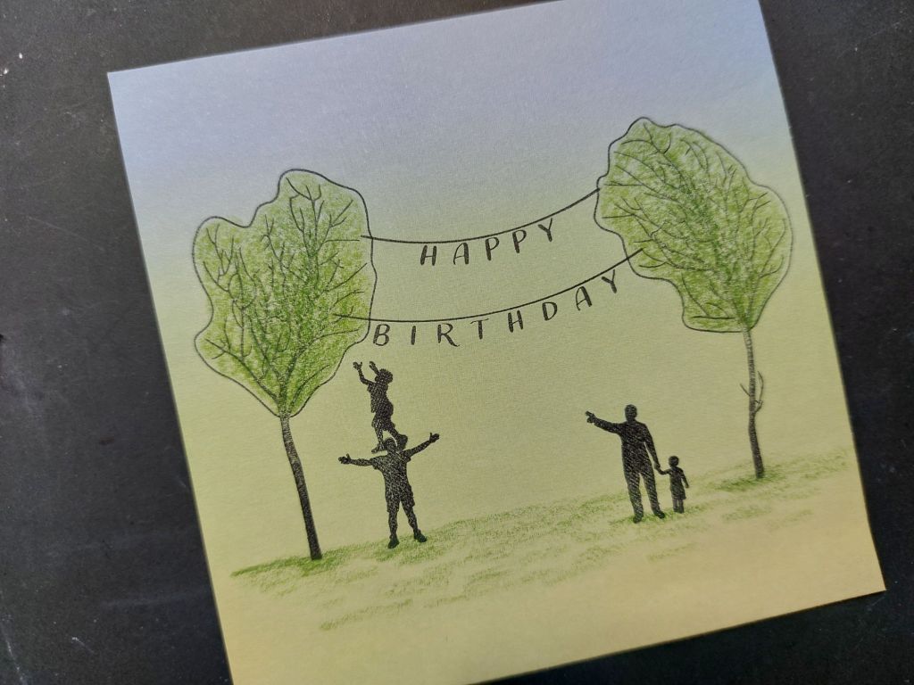 Anyway, here they are now! I shaded them in with two green Polychromo pencils, then stamped the figures from the Build a Landscape set – I’m not sure what Health & Safety (or Social Services!) would have to say about the little lad balancing on his dad’s shoulders to reach into the tree! Clearly the other chap is a much more responsible parent… 😂 Once the figures were stamped, I shaded in the ground with the green Polychromo, scribbling roughly for a bit of texture.