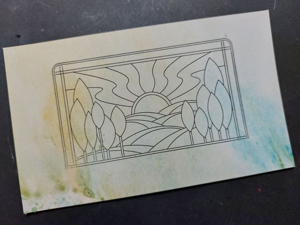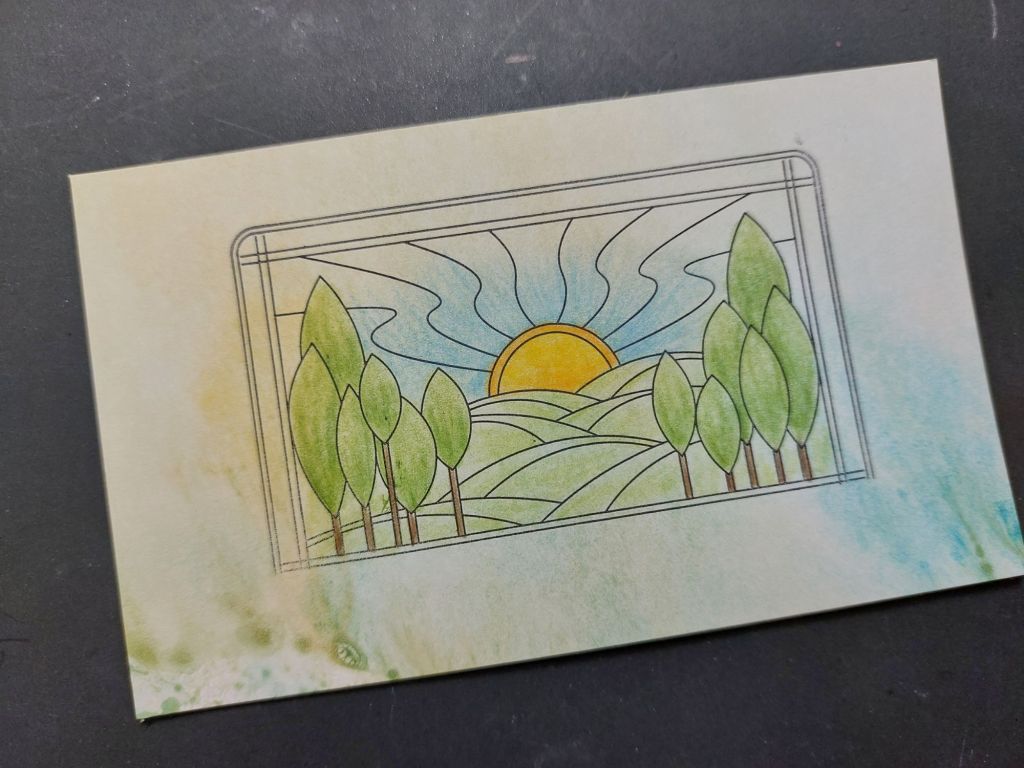 I started by cutting down a mop-up piece from last year’s summer retreat when we were creating backgrounds with acrylic paints spritzed with water (it’s been sitting in my folder since then!) I masked off the bottom box on the stamp with low tack tape, inked it up with black Archival and stamped it in the centre of my background. I then set about shading the scene with Polychromo pencils, just trying to emphasise the colour that was already in the background.