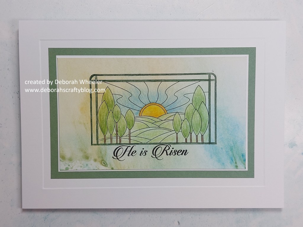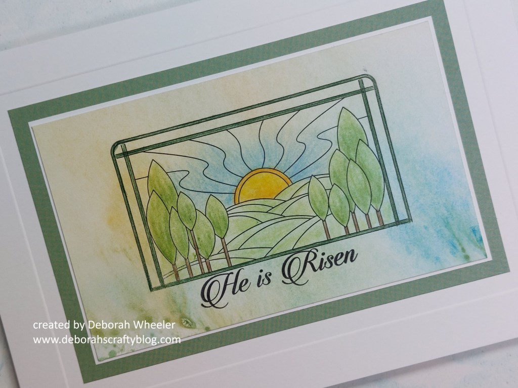 Allelulia, Christ is risen! It’s Easter morning and I’m just popping in with a quick post to share a celebratory card with you before heading off to church. I’ve made very few Easter cards this year – the last couple of months have been pretty full on, with a respiratory infection, new kitchen being fitted and overseas friends coming to stay! Plus all the normal life stuff as well… Anyway, today is definitely the most appropriate day for this card – I thought the sunrise scene from Clarity’s Art Nouveau stamps was perfect for Easter morning.