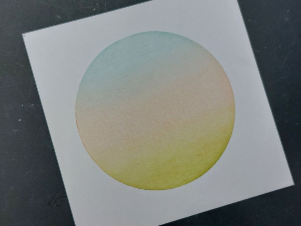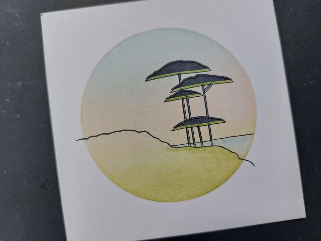 Next was to stamp the trees outline with black Archival ink, then I added the infill to the image, again in black. My positioning was a bit off, and I managed to stamp that one too high, so I had a gap along their bottom edges! Rather than throw the whole thing in the bin, I decided to make a feature of it and shaded in the gap with the ‘earth green yellowish’ Polychromo pencil – and I rather like the effect! I used a black Micron pen to extend the line for the land out through either side of the circle, then created the effect of the sea by adding a little of the ‘speckled egg’ with a waterbrush over the blended ink.
