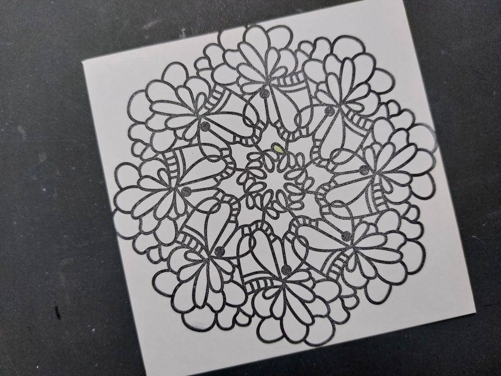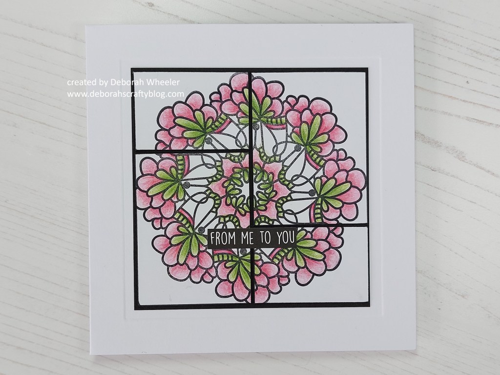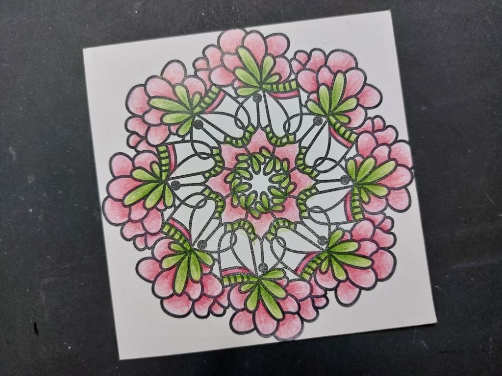 The first step was to stamp the large doodle round image onto a small square of premium card (it just fitted!) I then spent a happy while shading it in with my Polychromos, highlighting the centre portion and the flowers around the outside with ‘earth green yellowish’ and ‘permanent green olive’ for the leaves and ‘pink madder lake’, ‘rose carmine’ and ‘madder’ for the flowers and inner ring.