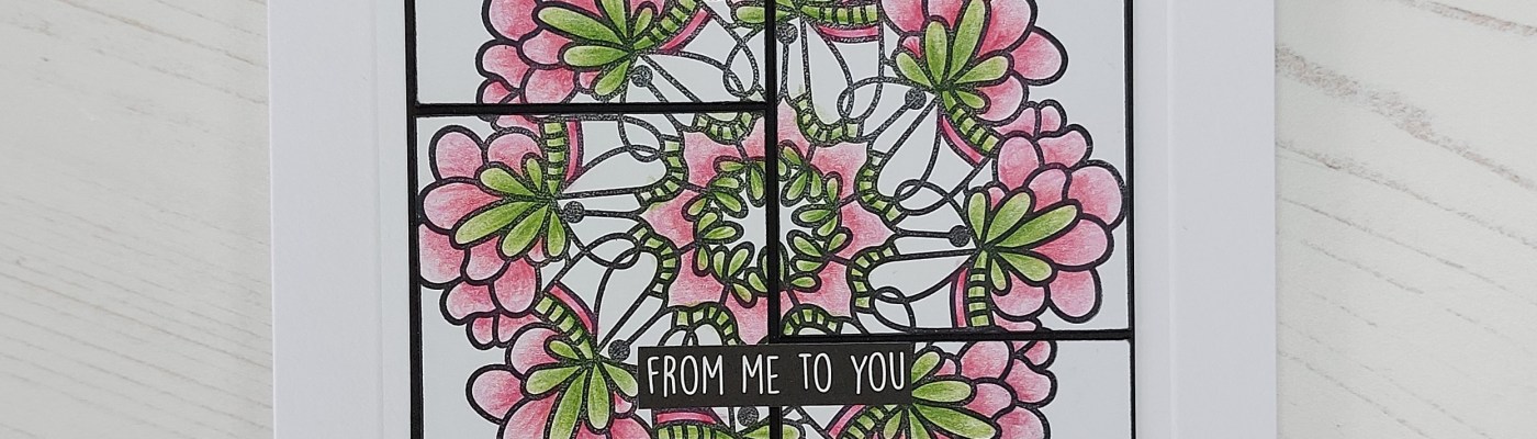The first step was to stamp the large doodle round image onto a small square of premium card (it just fitted!) I then spent a happy while shading it in with my Polychromos, highlighting the centre portion and the flowers around the outside with ‘earth green yellowish’ and ‘permanent green olive’ for the leaves and ‘pink madder lake’, ‘rose carmine’ and ‘madder’ for the flowers and inner ring.