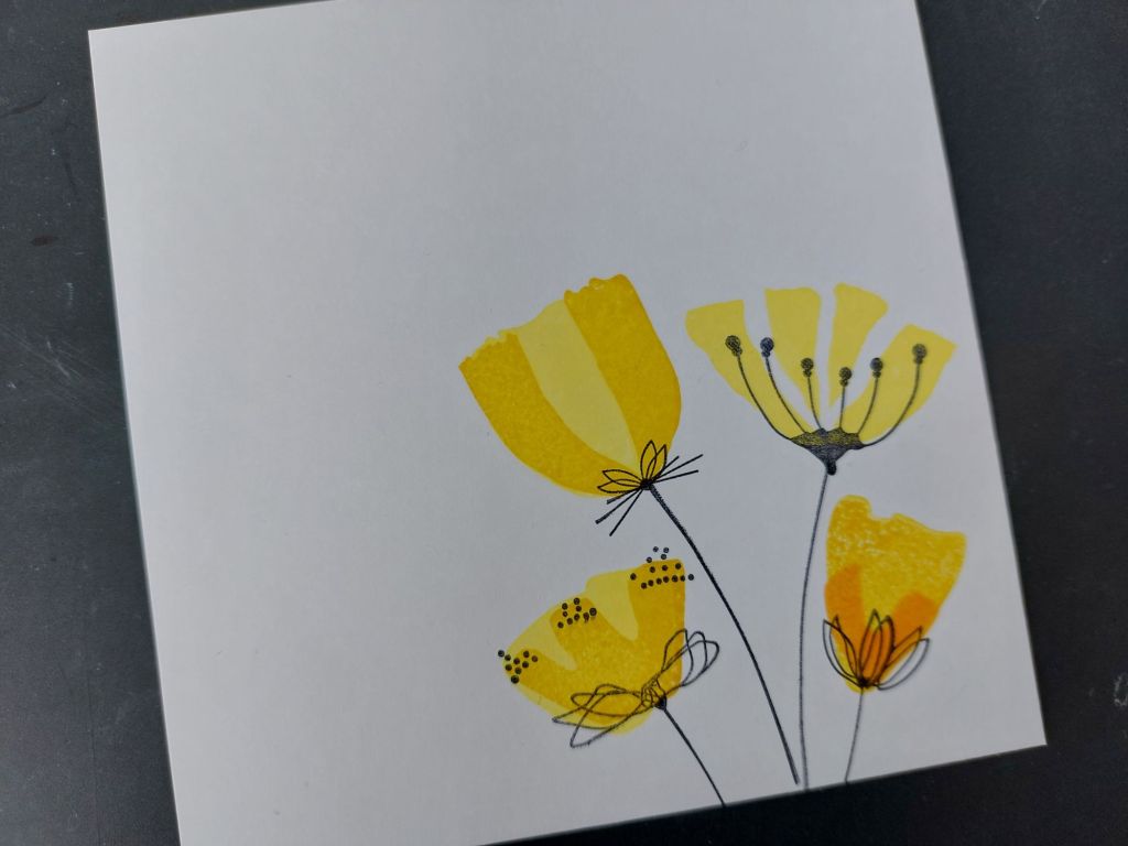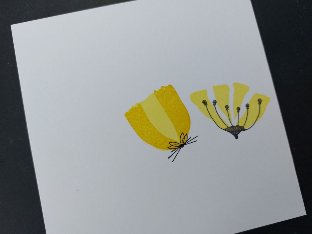 I then switched to Set 2 for the lower two flowers, following the same process with ‘squeezed lemonade for the base and ‘mustard seed’ for the top part, followed by black Archival ink for the ‘twiddly’ bits! I also added the stems using the thin line stamps in the sets.