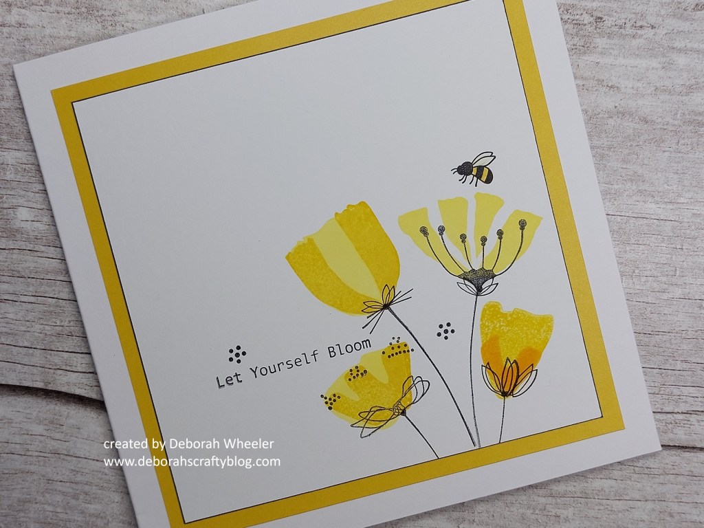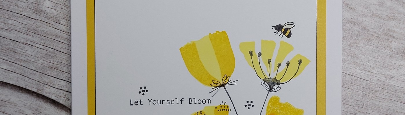 I was then on to finishing touches – the bee from the Just Butterflies & Bees set, the sentiment from Timestamp Creations’ Mother Nature set, and the little dots from the Build a Bloom stamps. I ran a black Sharpie around the edge of my topper, added a mount of Indian Summer companion paper and attached the whole piece to a 6×6 card blank.