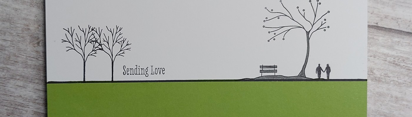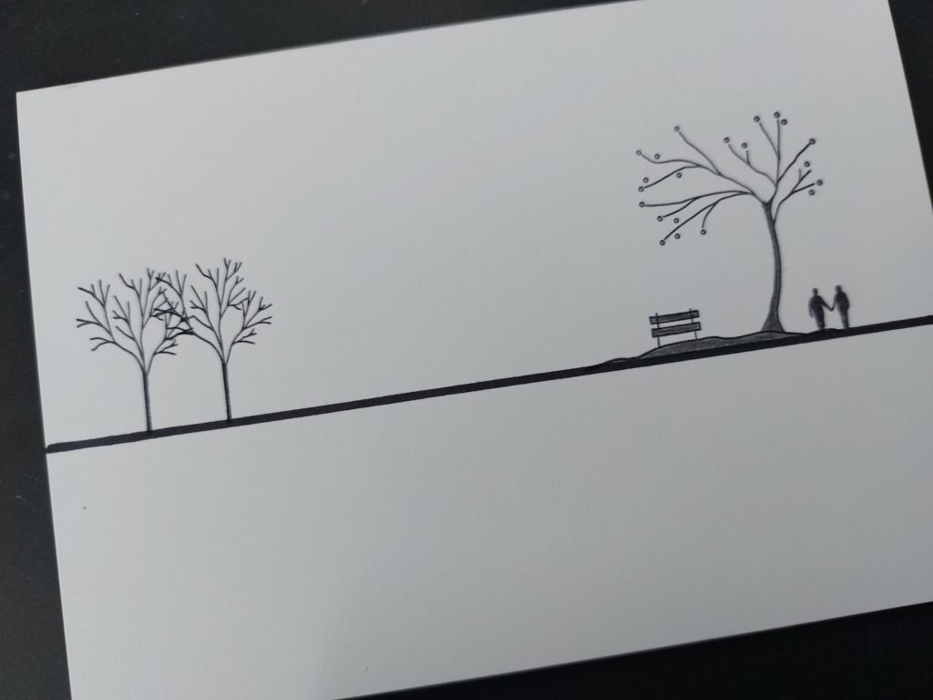 My process was very simple! I first drew a line across an A6 card blank with a Sharpie and a ruler, to anchor my stamped images. I then added the tree & bench, the walking couple, and two single trees all with black Archival ink, then shaded in the tree trunk, land and bench with my Payne’s Grey Polcyhromo pencil (from Clarity’s Essentials set).