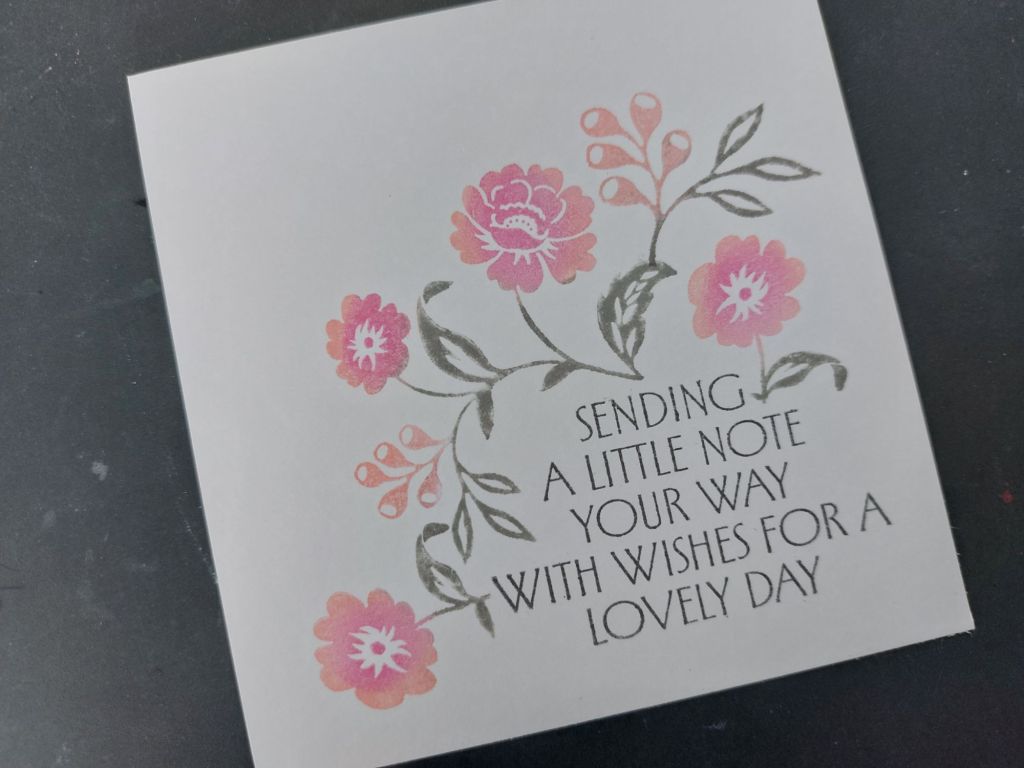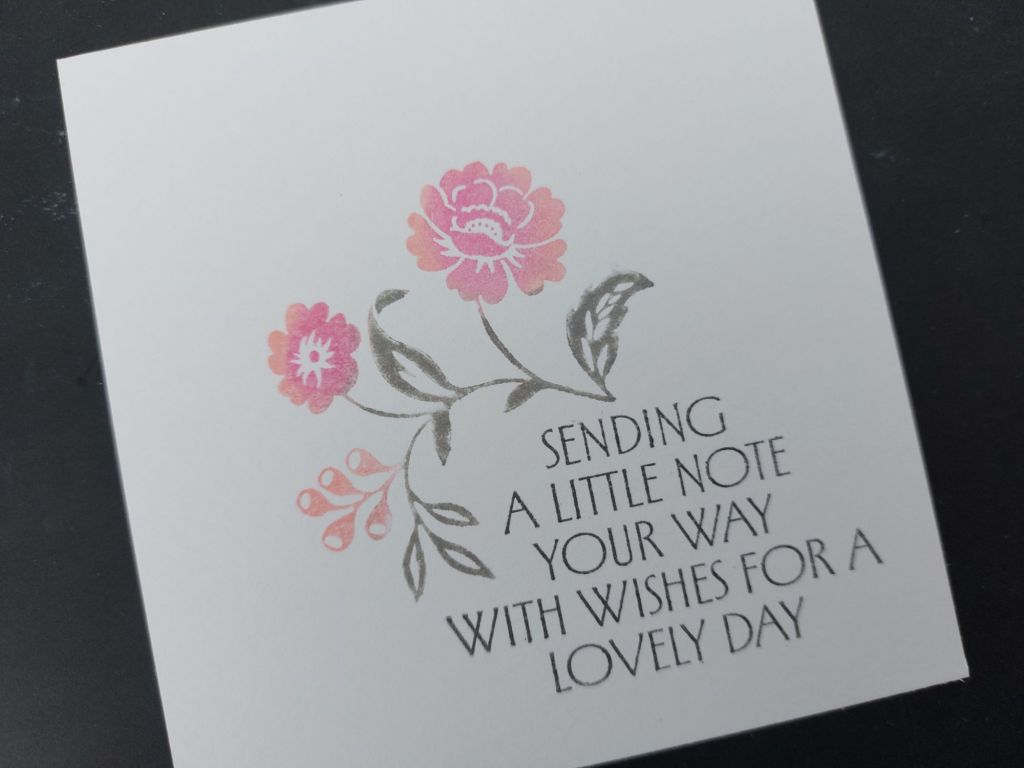 I cut a piece of Clarity’s premium card (also in the sale!) down to 4’5″ square and stamped the sentiment into the corner using ‘watering can’ Archival ink. I used spot-on sponges to add Distress Oxides to the larger floral stamp and added it to the card – ‘hickory smoke’ for the stems & leaves, and ‘saltwater taffy’ & ‘picked raspberry’ for the flowers , blending the ‘picked raspberry’ into the centre after I’d covered the flower with the ‘saltwater taffy’. I used the same process to add the smaller flower a couple of times (masking off part of the stem so it didn’t go over the sentiment), plus the berries image.