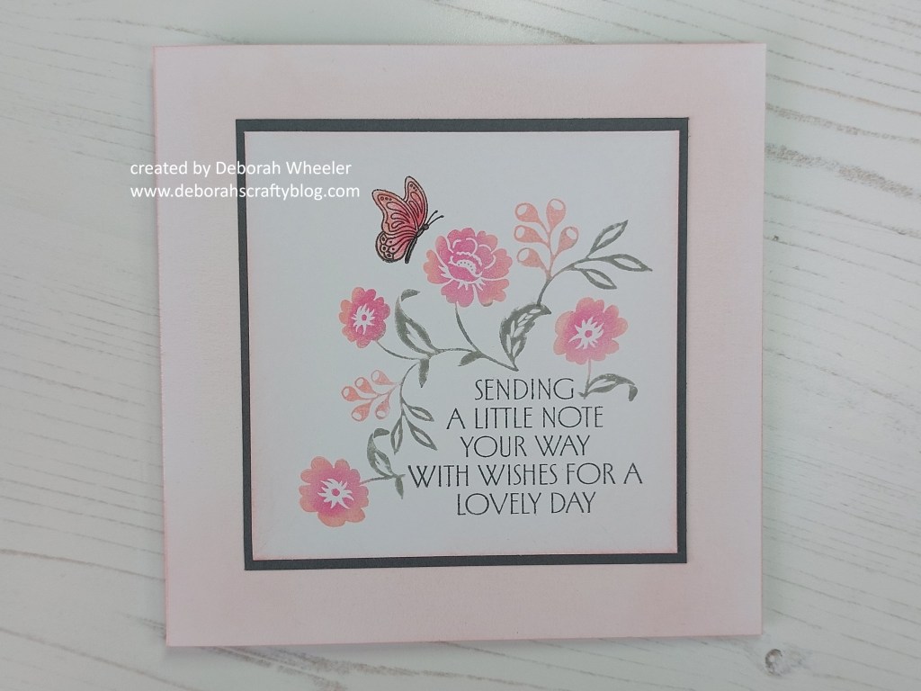I added one of the butterflies from the Just Butterflies & Bees set (another one at half price until Monday night) and shaded it with Polychromo pencils (rose carmine and coral). I laid the topper against a mount of grey card and on a 6×6 card blank, but thought it all looked very stark (I know, unusual for Mrs CAS here!) so lightly brushed the ‘saltwater taffy’ in from the card edges to soften it before attaching the grey mount. I still didn’t like it against the white card blank, so brushed more of the ‘saltwater taffy’ onto the front and then attached the topper – much better!