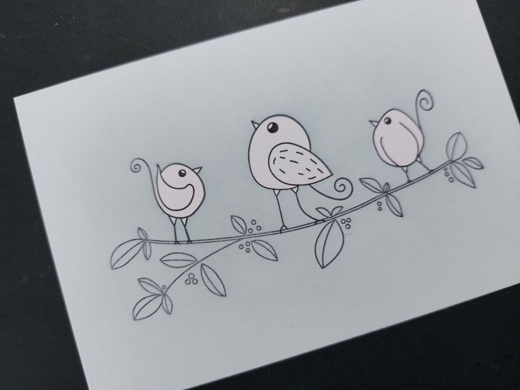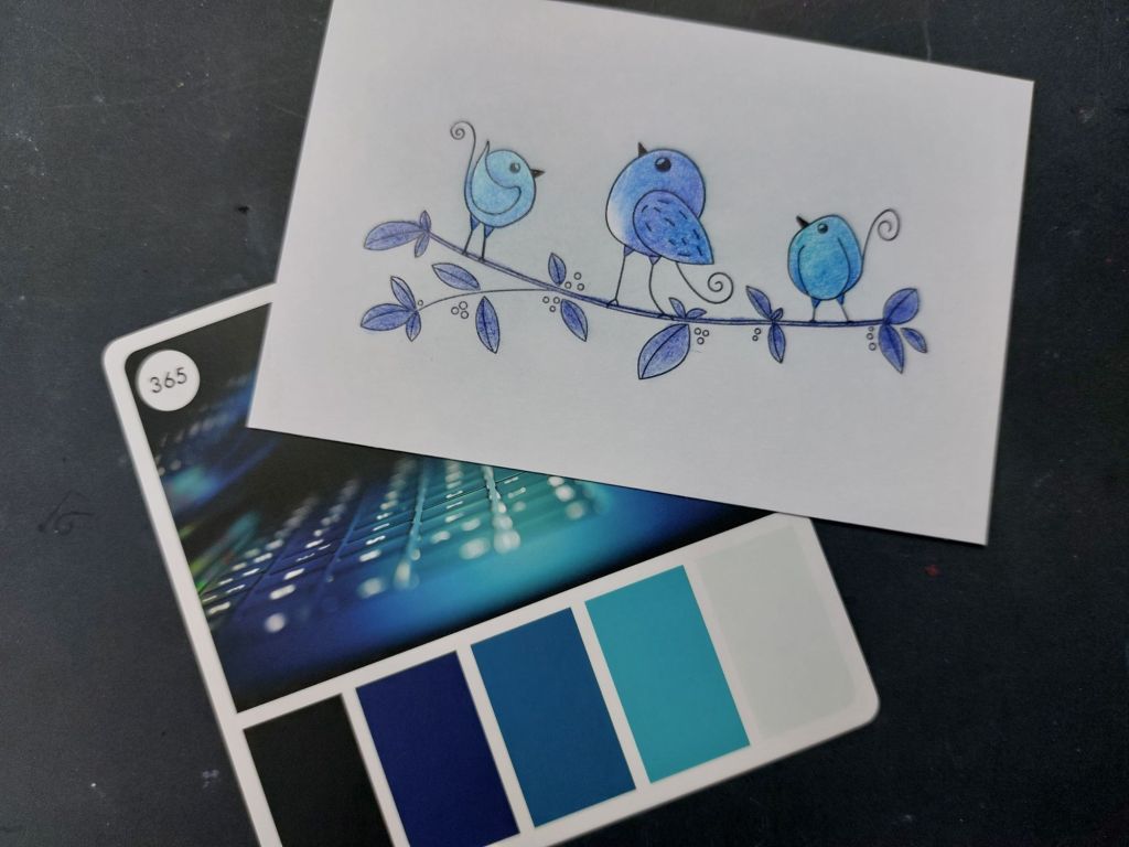 Next was to shade in the images with my Polychromos. I mentioned a while back that my son & his partner had gifted me the full set of four Colour Cube volumes for Christmas and, having used several from Vol 1 over the last few months, I’ve switched to Vol 2 (I worked out that I could use each volume for three months and will have put all four into action over the course of the year – and can then start again!) Anyway, with the help of my random number generator app, I wound up with card 365 and lots of blue tones, so off I went, shading the birds & leaves with ‘cobalt green’, ‘bluish turquiose’ and Pencil A4 from my Perga Liners pencils (it’s a lovely navy shade). I smoothed out the colours with a dry blending nib, then used a Perga Colour pen (#28) to dot in the berries.