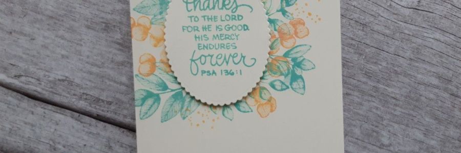 Hello crafty friends. Today’s card is another nice and simple CAS one, this time using one of the ‘Bible Verses’ set from Stampendous and Stampin’ Up!’s ‘forever fern’ stamp set. Once again I’ve managed to combine a few blog challenges with this one. I picked up the bible verse to fit The Paper Players‘ theme… Read More give thanks to the Lord